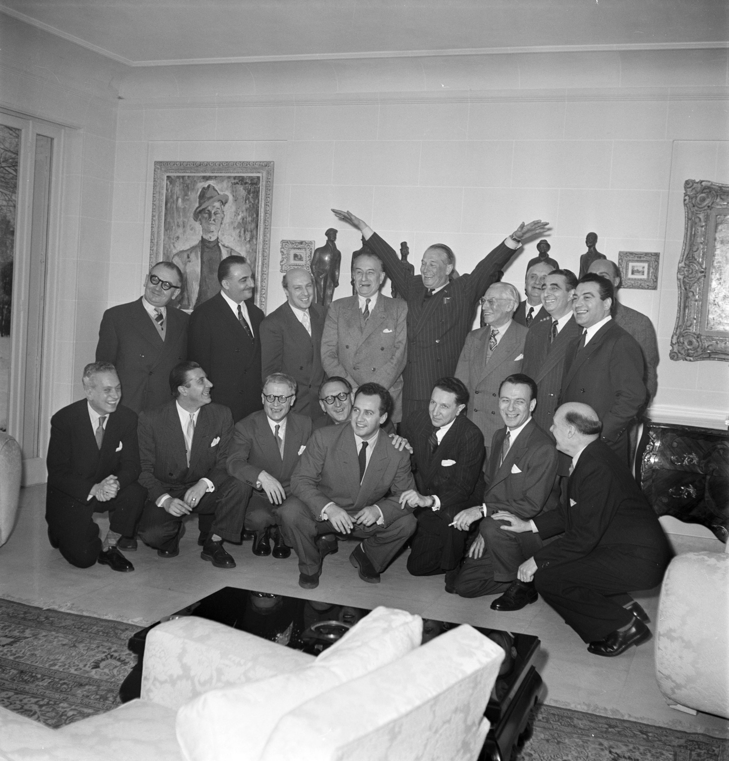 De gauche à droite, accroupis : Georges Tzipine, compositeur de musique de film ; Max François, auteur d’Oublie-moi ; Henry Verdun, compositeur de Moi, j’fais mes coups en-dessous ; Van Parys, compositeur de Ça s’est passé un dimanche ; Francis Lopez, compositeur de La belle de Cadix ; René Sylviano, compositeur de Premier rendez-vous ; Henri Contet, auteur de Boléro ; André Travnicek, compositeur de musique de film.